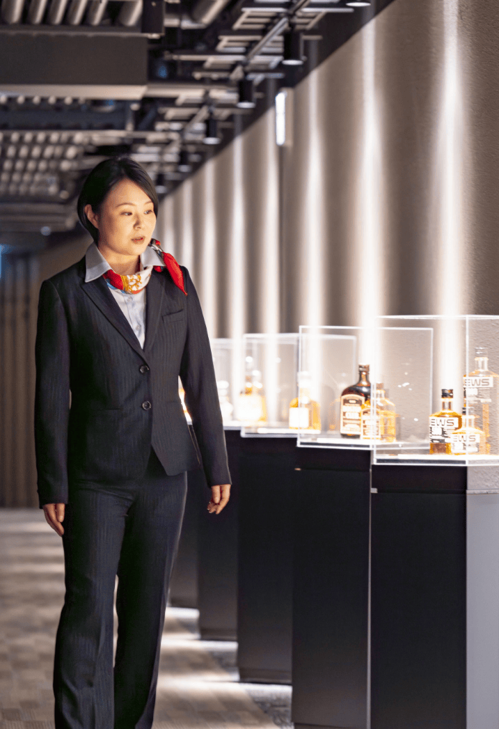 経験を積む中でガイドとしてキャリアを積みたい気持ちが⾼まっていた時に、キリングループ唯一のウイスキー蒸溜所の期限付き転勤の募集があり富⼠御殿場事業所へ転勤。2016年からはミドルガイドに着任し、ガイドの育成も担当。